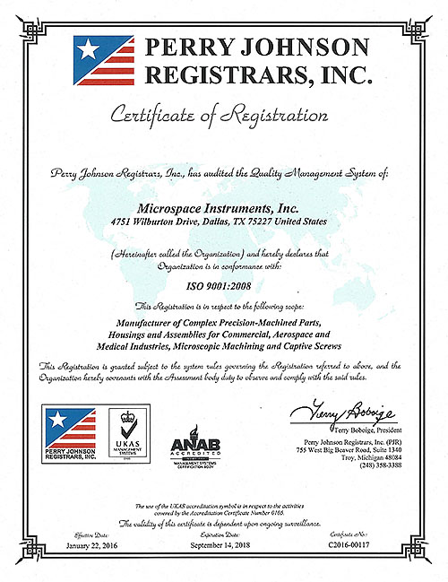 - Microspace is fully compliant with military quality-control requirements and is certified to ISO9001:2008. Certificate shown below.